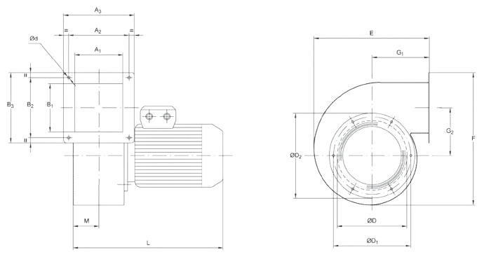 Вентилятори комплектуються асинхронними електродвигунами, однофазними або трифазними, 2-полюсними, виконання B3, зі ступенем захисту IP55, самовентильованими, розрахованими на безперервний режим роботи та такими, що відповідають стандартам UNEL та IEC.